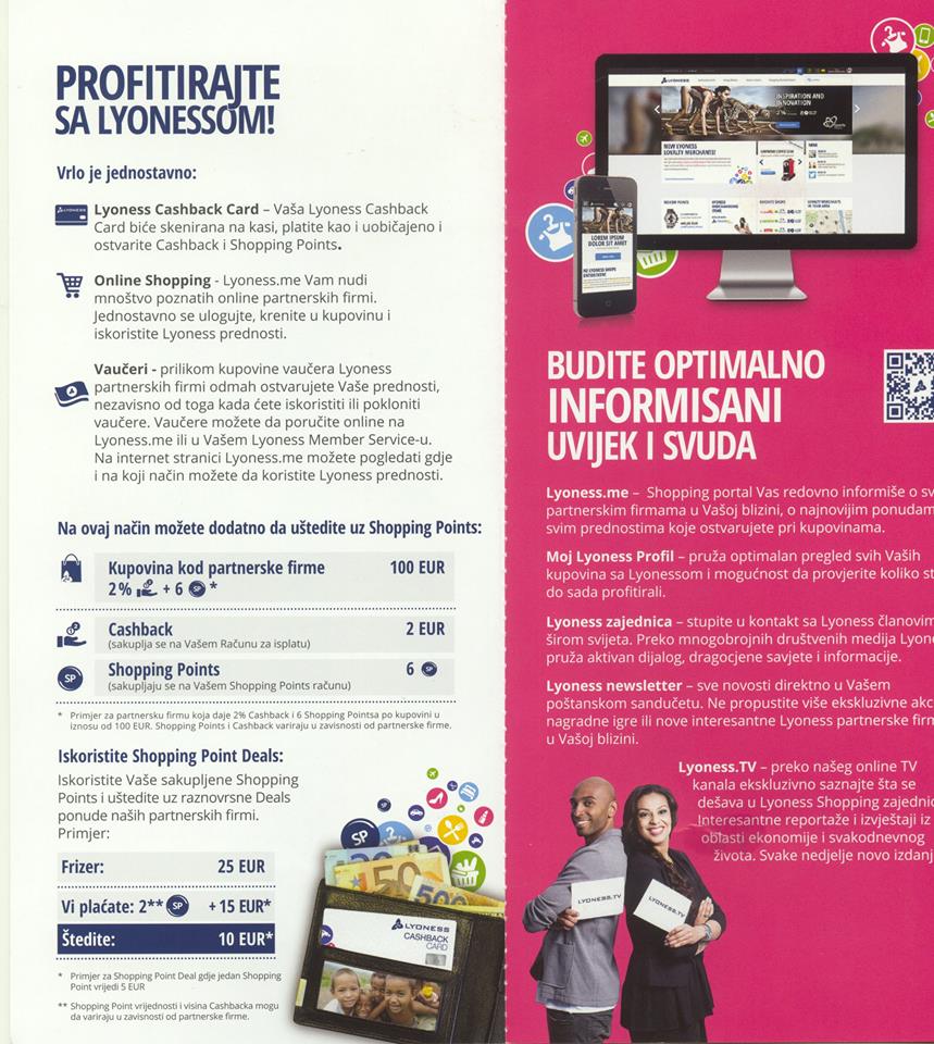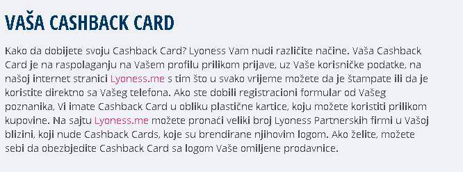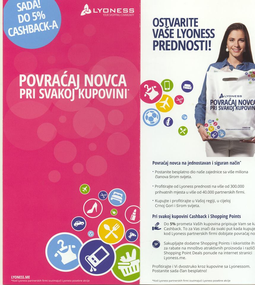 Nezavisno od toga da li kupujete sa Cashback karticom, vaučerom ili online – Vi dobijate do 5% vrijednosti Vaše kupovine natrag kao Cashback! Toliko jednostavno funkcioniše: Pokažite svoju Cashback Card na kasi, Lyoness Partnerskoj firmi i dobićete svoj povracaj novca. Dakle,dovoljno je ili posjetiti Facebook stranu i zatraziti svoju Lyoness cashback karticu,bez pretplate i obaveza.Ukoliko nemas Facebook nalog,onda u komentaru ostavi svoj upit.